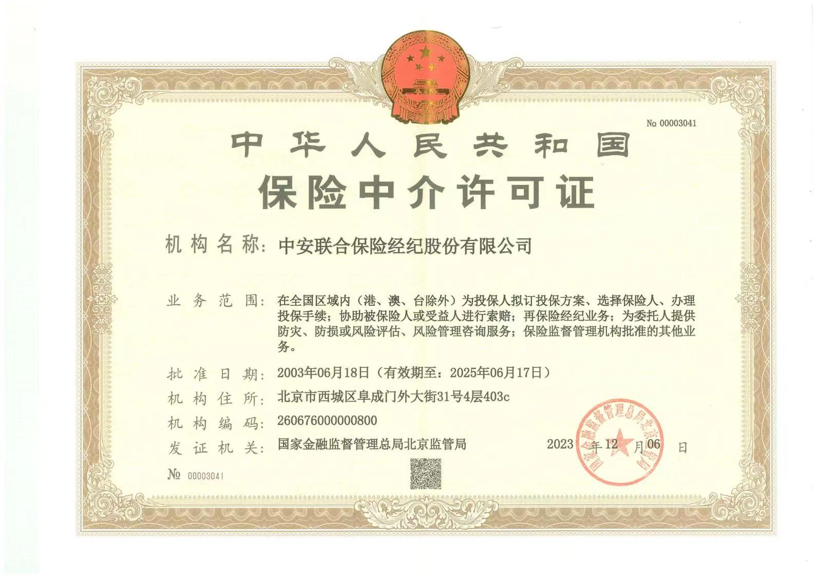 中安联合保险经纪股份有限公司是经中国保险监督管理委员会批准成立的全国性、综合性保险经纪公司。公司总部设在北京,注册资本金人民币5000万元。 在全国区域内(港、澳、台除外)为投保人拟订投保方案、选择保险人、办理投保手续;协助被保险人或受益人进行索赔;再保险经纪业务;为委托人提供防灾、防损或风险评估、风险管理咨询服务;保险监督管理机构批准的其他业务。